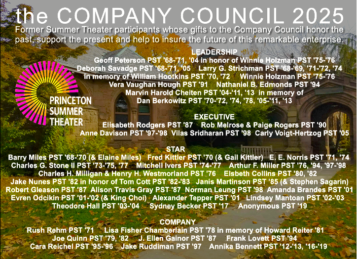 The Princeton Summer Theater COMPANY COUNCIL is made up of participants from the past fifty years whose support is helping to keep live theater on the Murray stage for many summers to come.